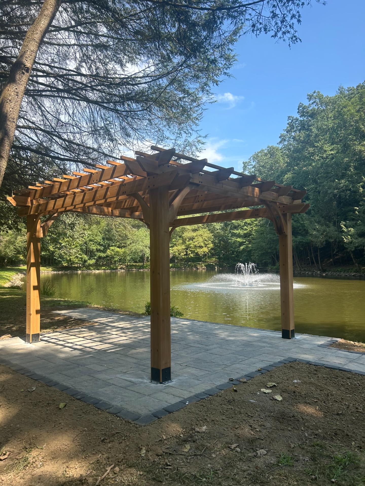 The patio opens up into a welcoming space perfect for gathering, and the pergola frames the lakeside view while adding just the right amount of shade and character. Altogether, it feels like a private retreat—calm, connected, and designed for both quiet mornings and lively evenings with family and friends.
